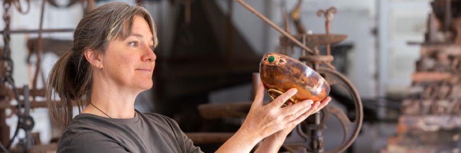 In 2004 a QEST Scholarship enabled Siān to return to coppersmithing a decade after her apprenticeship, and to consolidate and refresh her skills. After ten years as a full-time parent of four, she enrolled at London Metropolitan University and completed an MA by Project (Metal) in twelve months. In the same year she built her first workshop and began a small business making one-off pieces of bespoke copperwork and undertaking commissions.